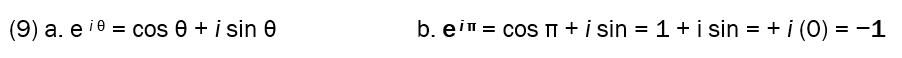 Euler’s formula (9a), to express complex exponentiation through rotation in the complex plane, shows how multiplication by eiθ corresponds a counterclockwise turn by θ radians around the unit circle (as seen already in Figure 3), which for θ = π yields Euler’s identity (9b):
