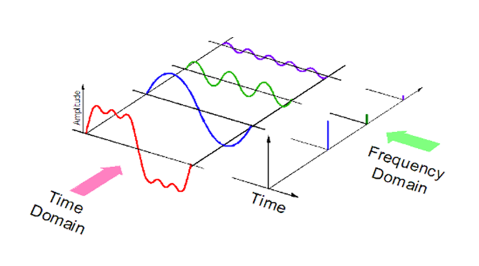 Figure 1: View of a signal in the time and frequency domains, from Kinder Chen’s Denoising Data with Fast Fourier Transform