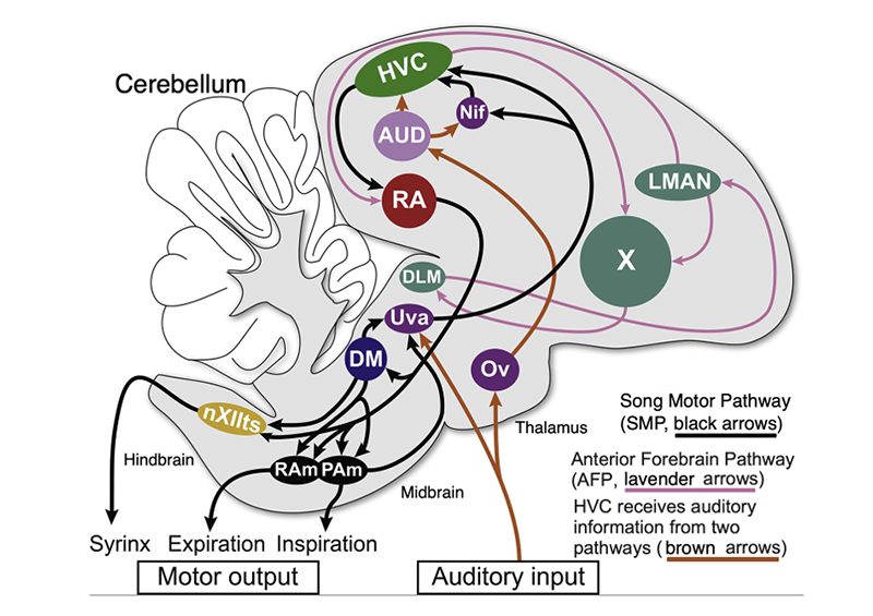 Figure 5 [Adapted from Amador et al. 2017] Schematic of songbird’s song system and sensory pathways, comprised of the song motor pathway (SMP, black arrows) and anterior forebrain pathway (levender arrows). In turn: