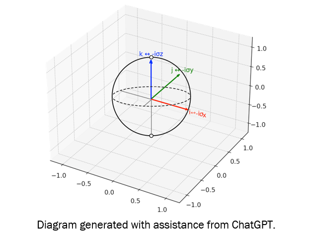 Figure 9. Quaternion units (i, j, k) correspond to Pauli matrices (σx, σy, σz) up to factors of i, reflecting an isomorphic algebraic structure and shared role in representing rotations within a Hilbert space.