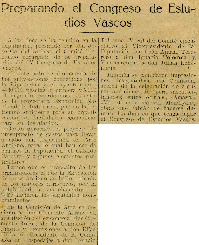- Reunión en Diputación del Comité Ejecutivo del IV Congreso. Se aprueba presupuesto Exposición Arte Antiguo. Relación de Comisiones y presidentes.