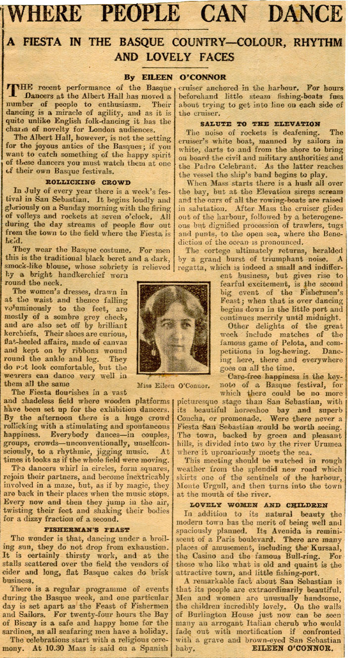 - Sobre bailes vascos, a colación del grupo vizcaino que ha participado en el festival del "English Folk Dance Society" en el Royal Albert Hall. Retrato fotográfico de la autora.
