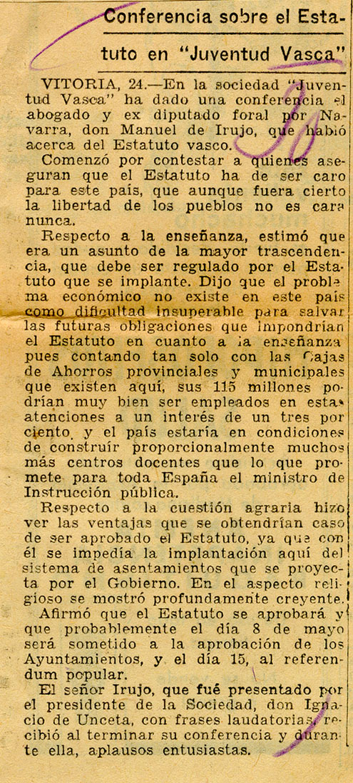 - Conferencia sobre el Estatuto en "Juventud Vasca".