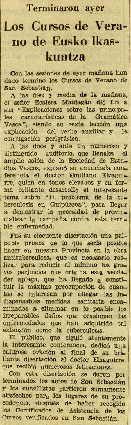 - Reseñas conferencias de Escalera sobre gramática vasca e Eizaguirre sobre "El problema de la tuberculosis en Guipúzcoa.