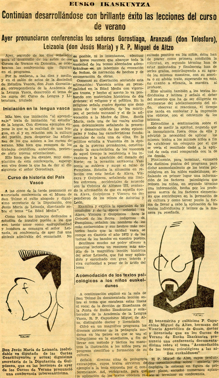 - Reseñas conferencias de Leizaola sobre "La Edad Media" y de Alzo sobre "Acomodación de los textos psicológicos a los niños euskaldunes". Caricaturas de los conferenciantes por Txiki.