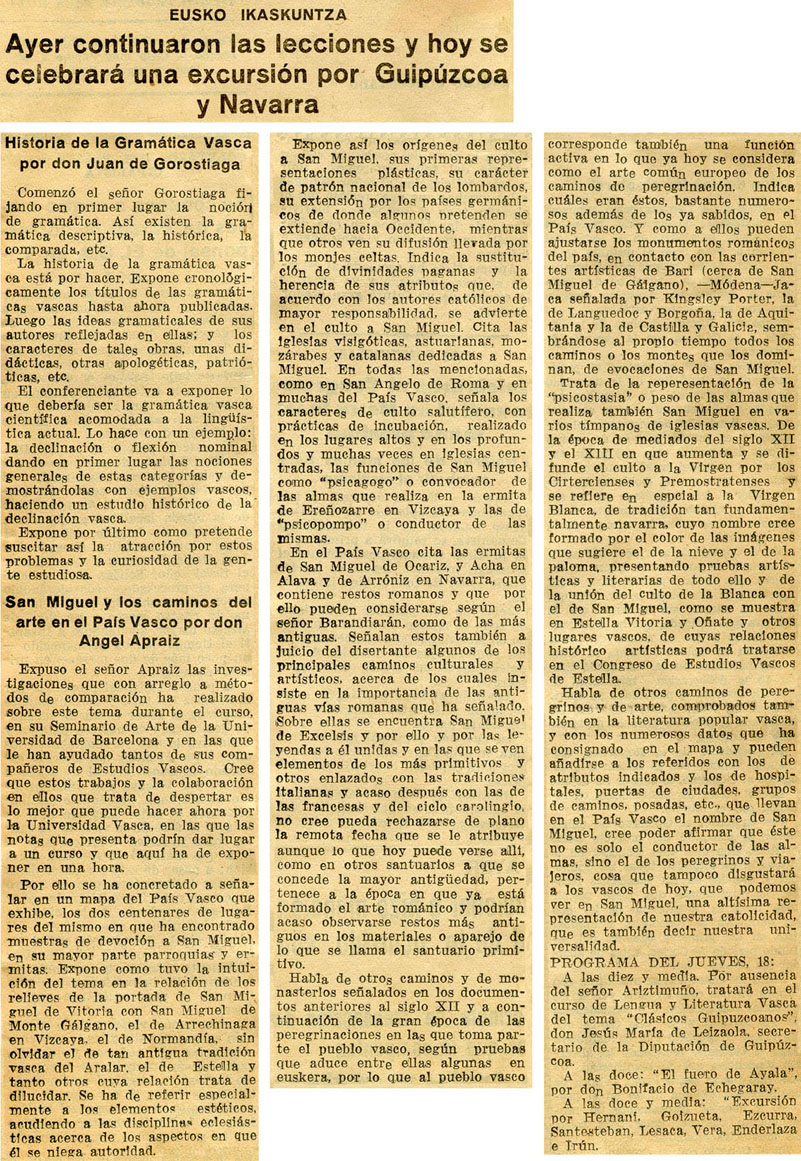 - Reseña conferencias de Gorostiaga sobre historia de la gramática vasca y de Apraiz sobre la representación de San Miguel en el arte vasco. Programa.