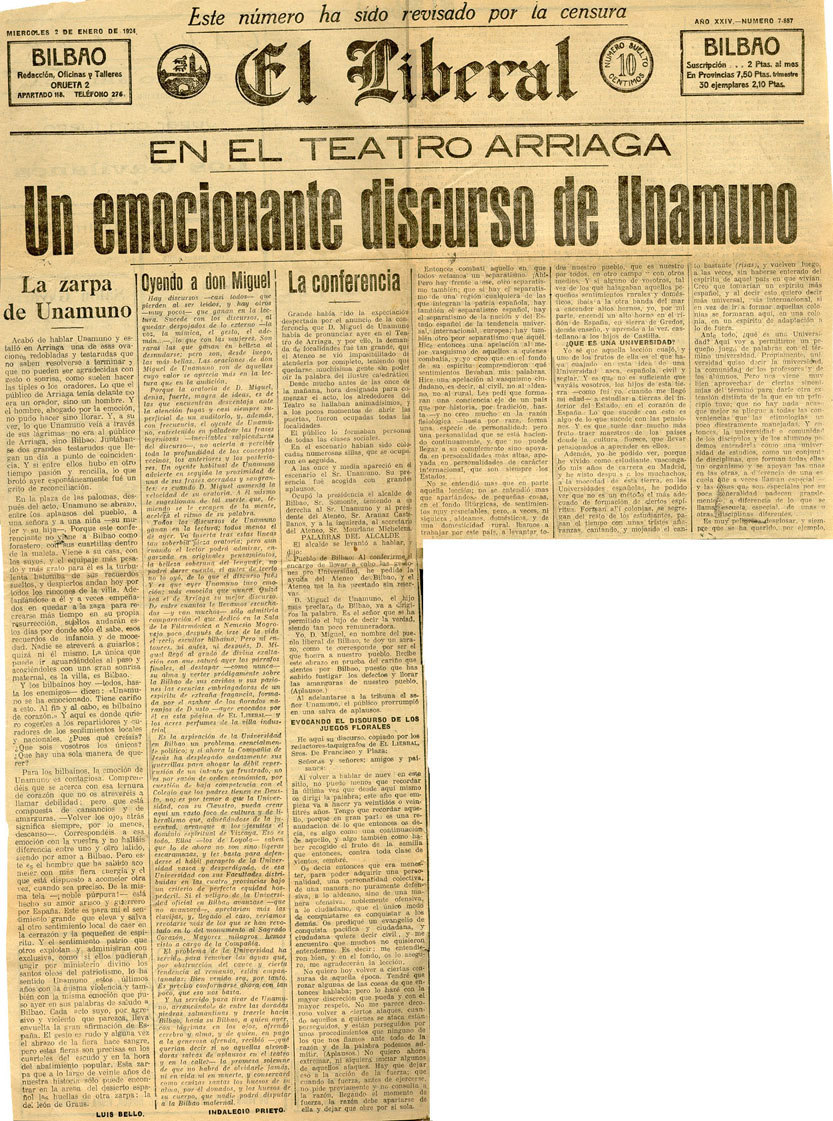 - En el Teatro Arriaga. Un emocionante discurso de Unamuno.