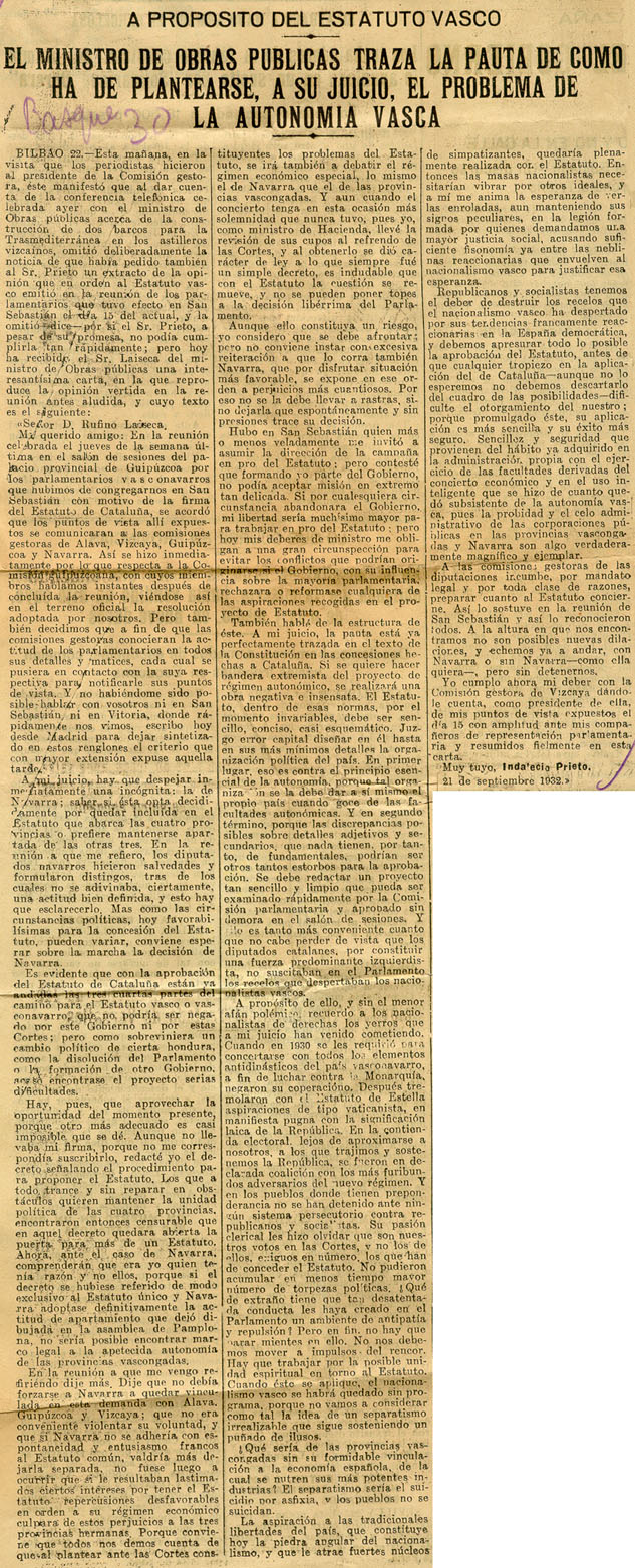 - A propósito del Estatuto Vasco. El Ministro de Obras Públicas traza la pauta de cómo ha de plantearse, a su juicio, el problema de la Autonomía vasca.