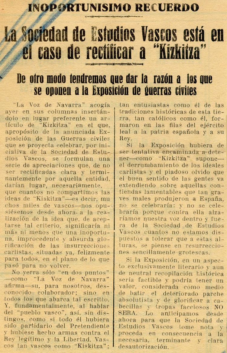 Inoportunísimo recuerdo. La Sociedad de Estudios Vascos está en el caso de rectificar a "Kizkitza".