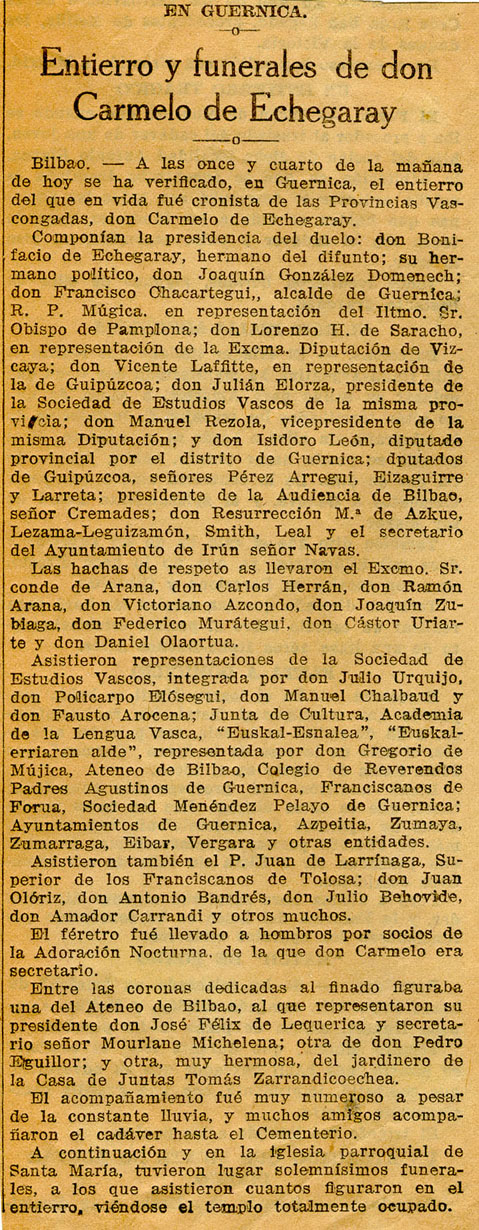 - En Guernica. Entierro y funerales de don Carmelo de Echegaray.