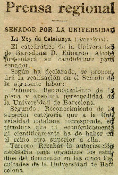 - El catedrático Alcobé presenta su candidatura al Senado. Propugna el reconocimiento de autonomía y el establecimiento de doctorados en la Universidad de Barcelona.
