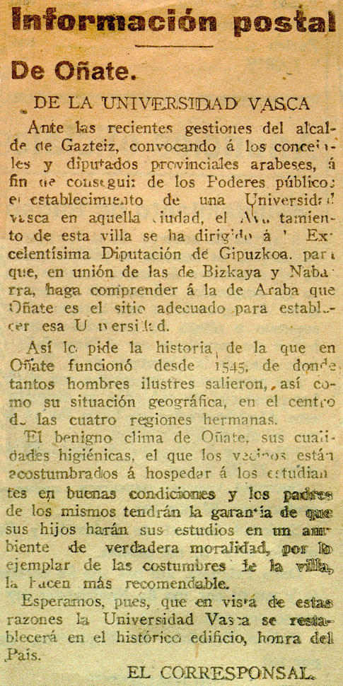 Información postal de Oñate. De la Universidad Vasca.