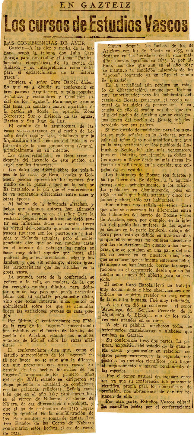 - Reseña de la conferencia de Caro Baroja "Particularidades etnográficas de la Cuenca del Bidasoa...ara el esclarecimiento de la historia vasca"