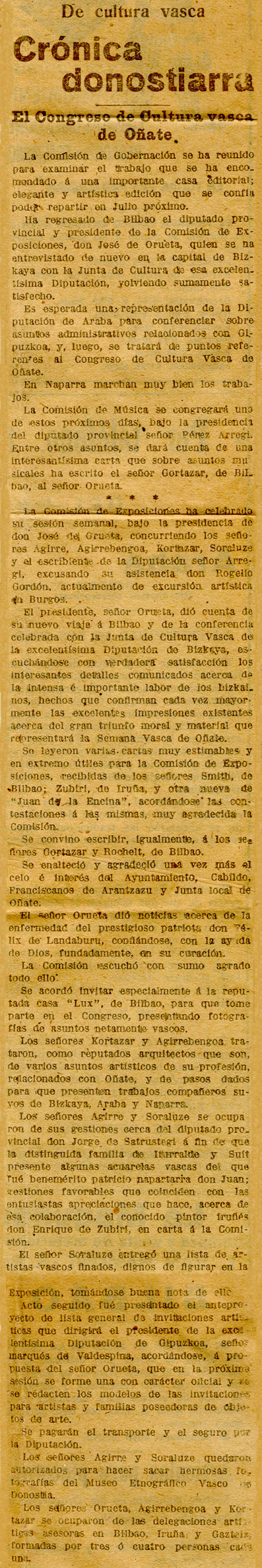 - De Cultura Vasca. Crónica donostiarra. El Congreso de Cultura vasca de Oñate.