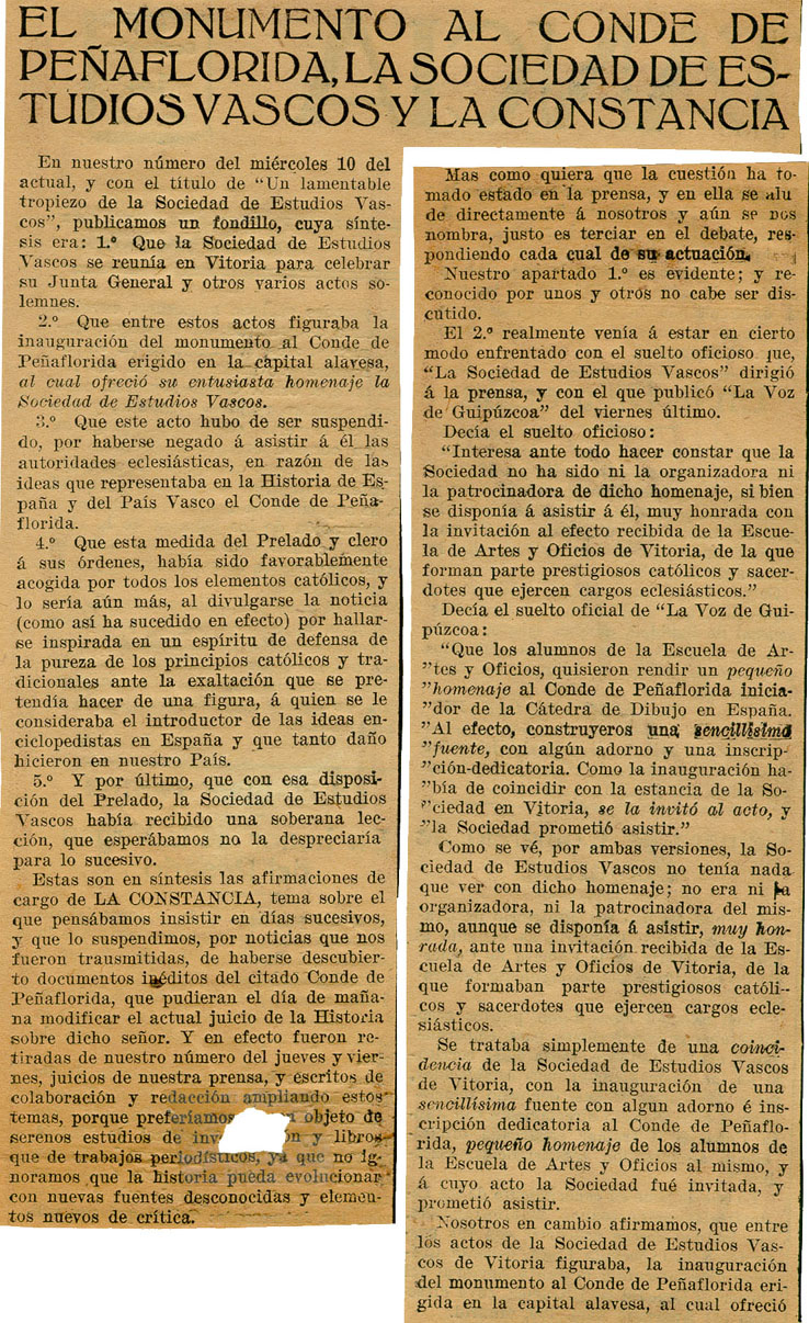 - El monumento al conde de Peñaflorida, la Sociedad de Estudios Vascos y La Constancia.