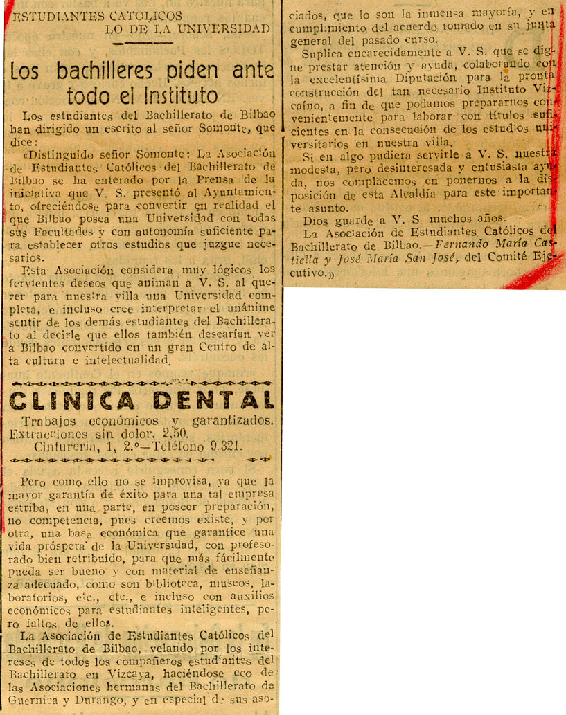 - Reproduce escrito dirigido al alcalde Somonte por la "Asociación de Estudiantes Católicos del Bachillerato de Bilbao".