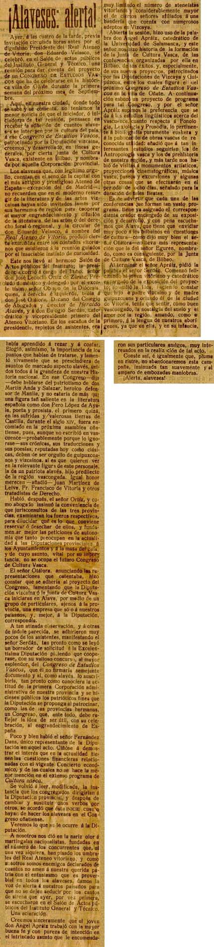 - Reseña de reunión habida para la formación de comisión alavesa pro Congreso de Estudios Vascos. Asistentes e intervenciones más destacadas.