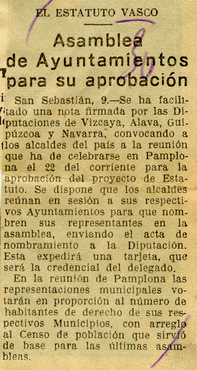 - El Estatuto vasco. Asamblea de Ayuntamientos para su aprobación.