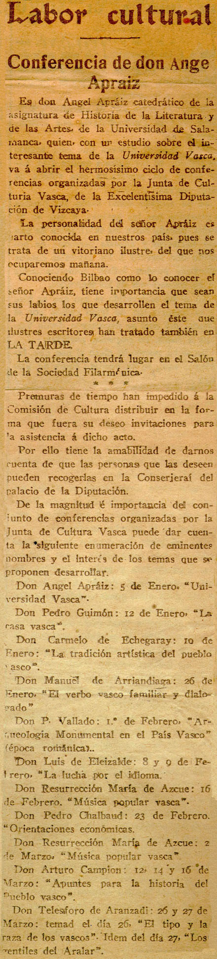- Labor cultural. Conferencia de don Angel Apraiz.