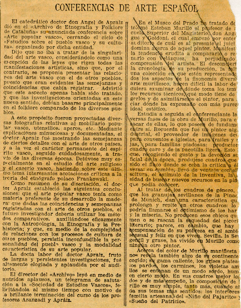 - Reseña de la conferencia de Apraiz sobre "Arte Popular Vasco" que cierra el ciclo "Estudios sobre el pueblo vasco y su cultura" organizado por el Archivo.