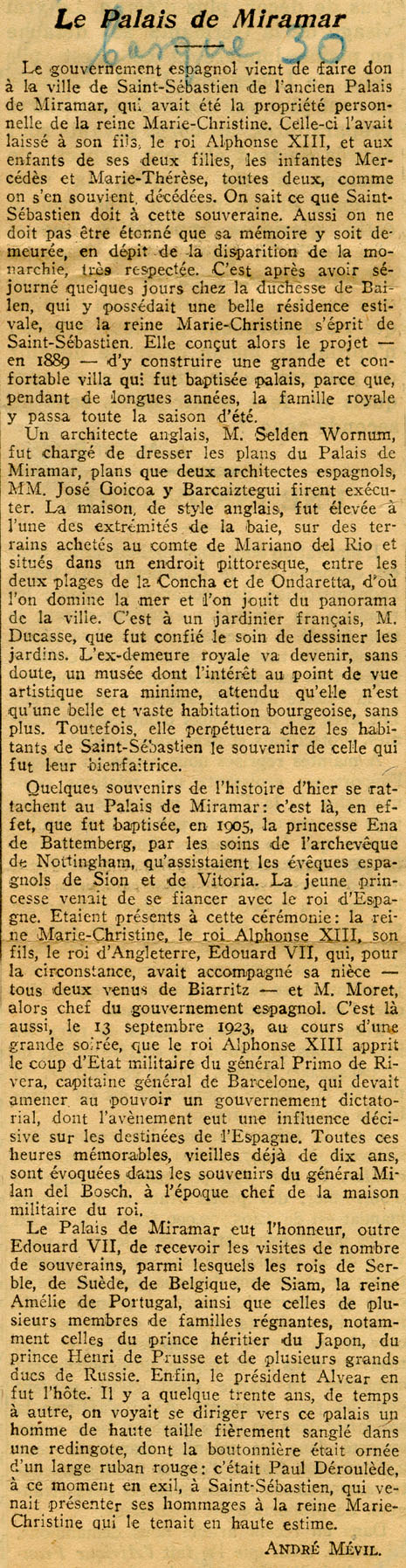 - El Gobierno cede el palacio al municipio donostiarra.Breve historia del edificio y su construcción, ocupantes y visitantes.