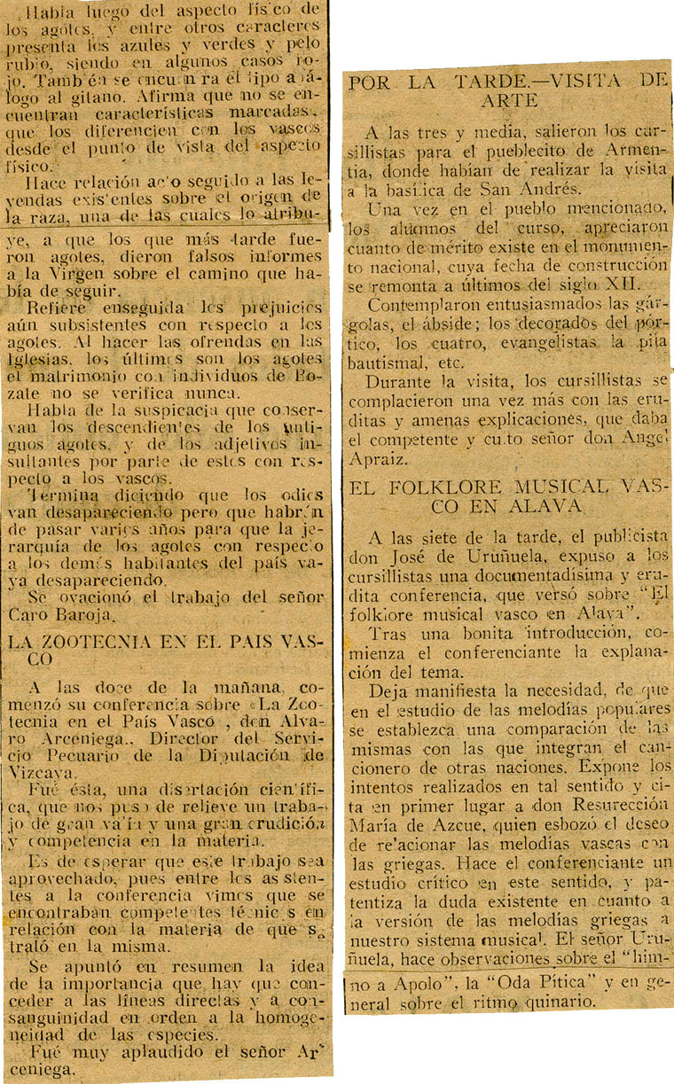 - [Conferencia sobre la cuenca del BidasoaReseña de la conferencia de Caro Baroja "Particularidades etnográficas de la Cuenca del Bidasoa...ara el esclarecimiento de la historia vasca", del doctor Arceniega sobre "La Zootecnia en el País Vasco" y de Uruñuela sobre "El Folklore musical vasco en Alava".
