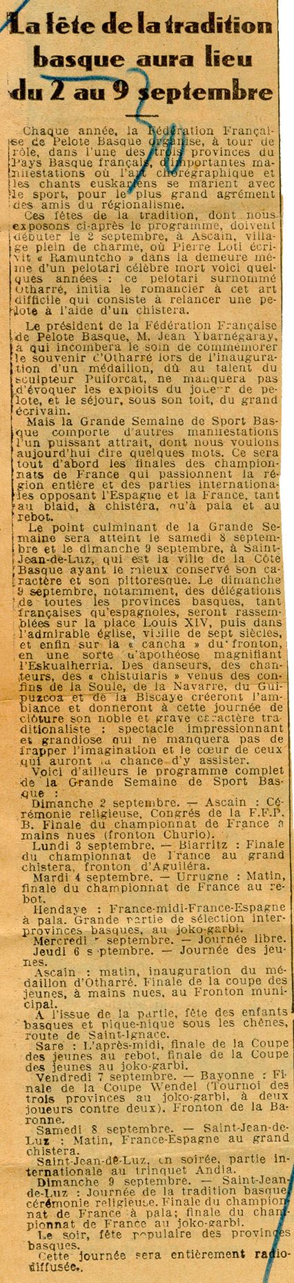 - Le fête de la tradition basque aura lieu du 2 au 9 septembre.