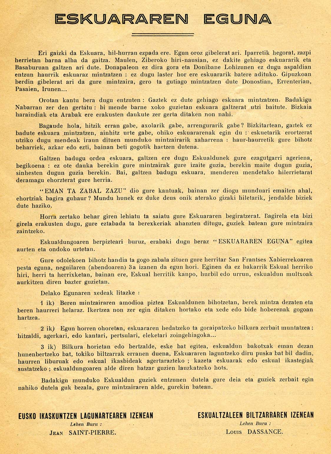 - Manifiesto firmado por Jean Saint-Pierre, Sociedad de Estudios Vascos, y Louis Dassance, Euskaltzaleen Biltzarra, que recoge las conclusiones del Día del Euskera.