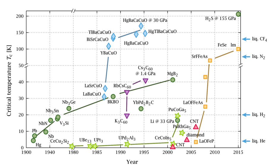 Figure 1 shows the time evolution of the critical temperature of various superconductors since the discovery of superconductivity in mercury (Hg) until 2015.