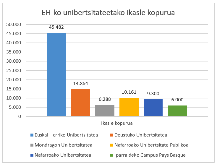 - Euskal Herriko Unibertsitatea UPV/EHU unibertsitate publikoa (1980). Campusak: Leioa-Bilbo, Donostia eta Gasteiz. Gradu mailako ikasketa guztiak euskaraz eta gaztelaniaz eskaintzen ditu. 45.482 ikasle; 4.545 irakasle eta 1.897 AZPko langile.