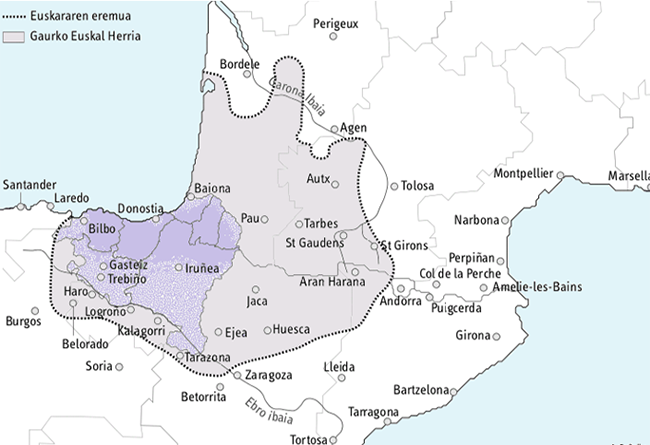 Basque is oftentimes claimed to be Europe’s oldest language still in use[1]. Apparently, Vasconia and Aquitaine were partially involved in intermittent Romanization attempts that eventually were—at least partly—successful. Romanization—and, most relevantly, Latinization—is likely to have performed as an urban-to-rural phenomenon (Echenique 2012). As for the Latinization process, this appears to intensify from its early stages (56 BC), notably along the southern Pyrenees. The decline of the Roman Empire goes hand in hand with a ruralization process, which Basque-speaking territories appear to have used to their advantage prior to attaining their maximum expansion—both east- and westward.