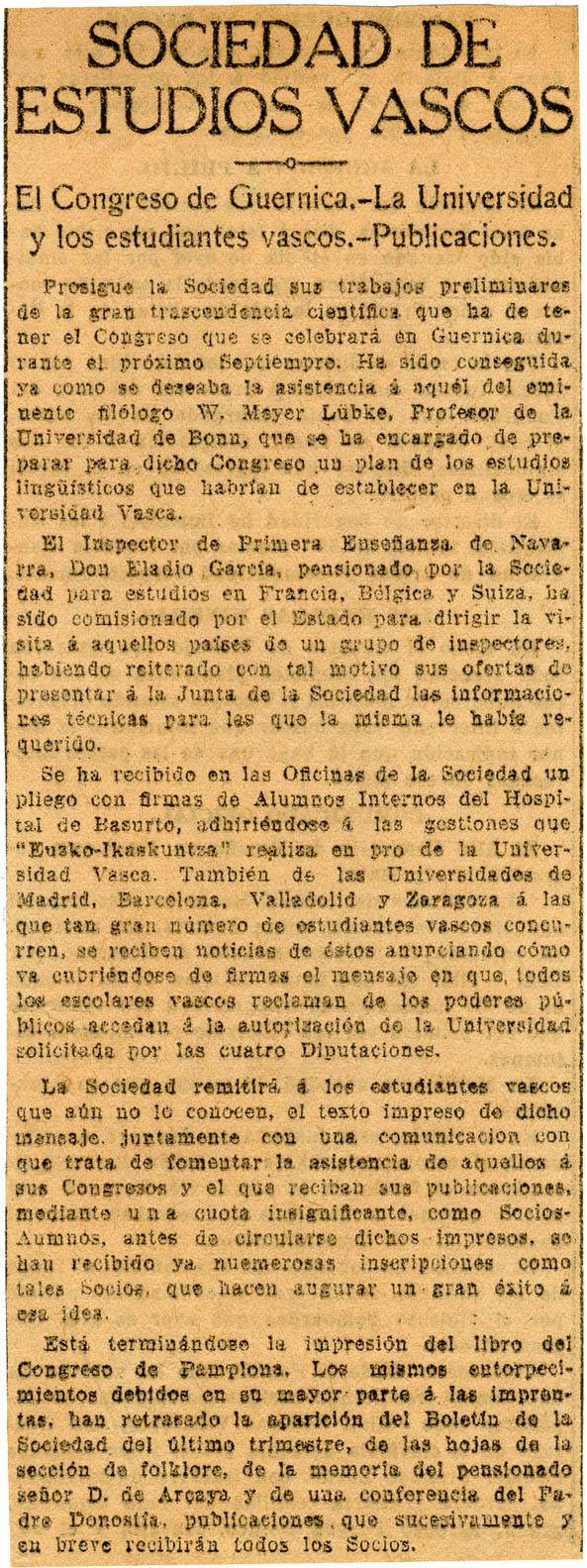 - Sociedad de Estudios Vascos. El Congreso de Guernica. La Universidad y los estudiantes vascos. Publicaciones.