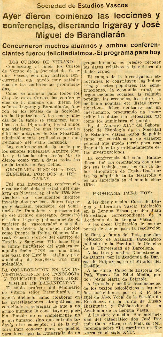 - Sociedad de Estudios Vascos. Ayer dieron comienzo las lecciones y conferencias , disertando Irigaray y José Miguel de Barandiarán.