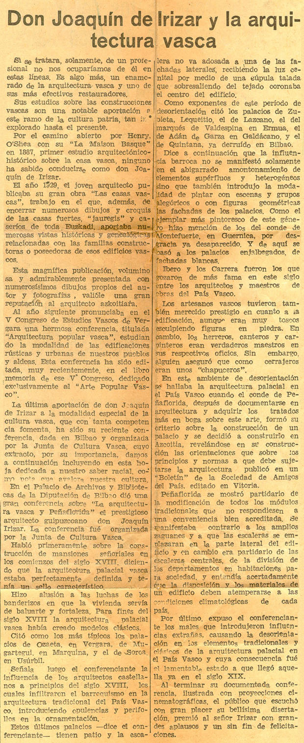 - Letras y arte vasco. Don Joaquín de Irizar y la arquitectura vasca.