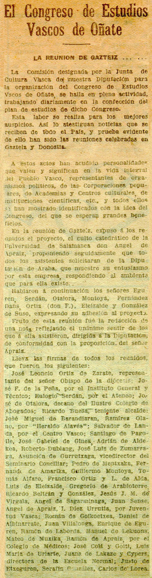 - Crónica de reunión preparatoria tenida en Gasteiz. Relación de asistentes y firmantes de adhesión.