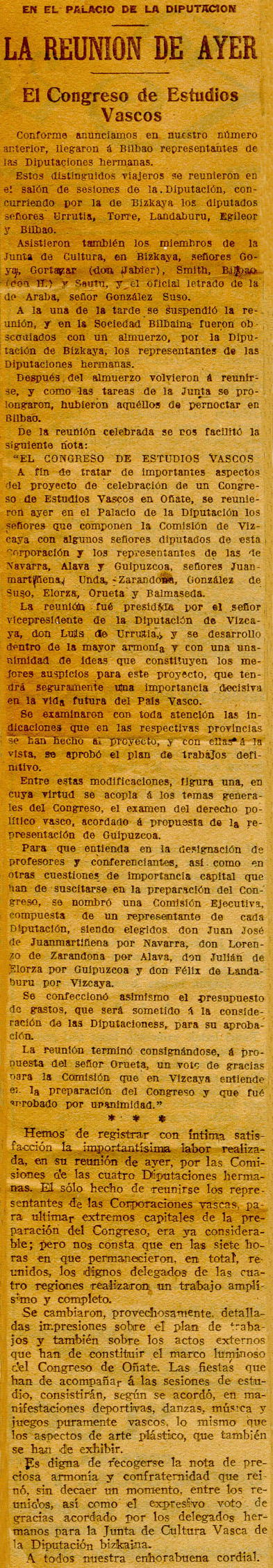 - En el palacio de la Diputación. La reunión de ayer. El Congreso de Estudios Vascos.