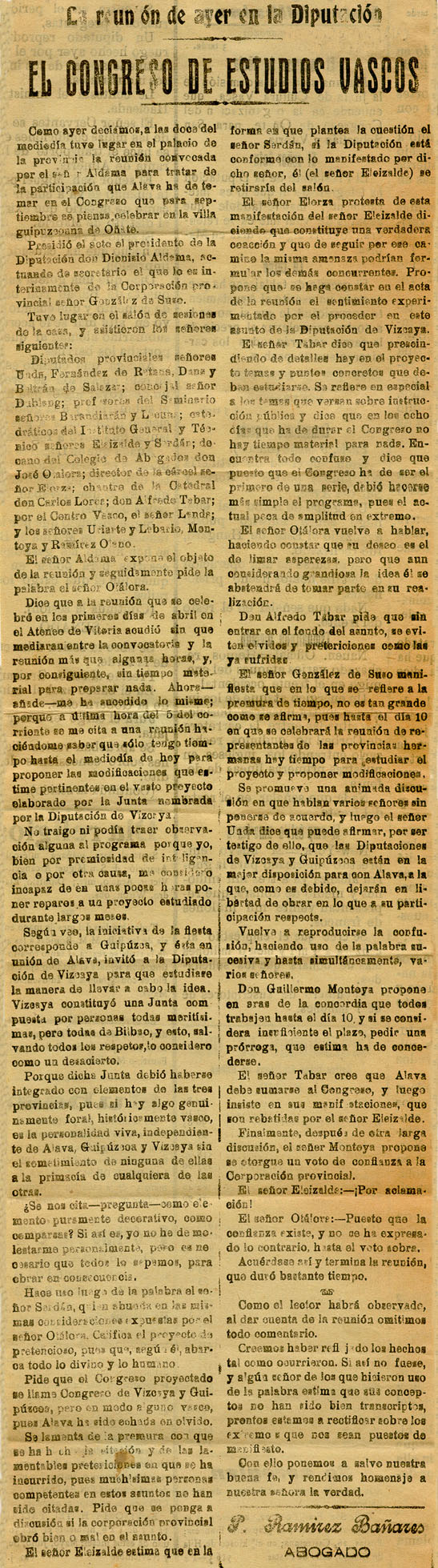 - Reseña de asistentes y crónica de reunión celebrada en la Diputación para tratar del Congreso. Polémica sobre la participación alavesa.