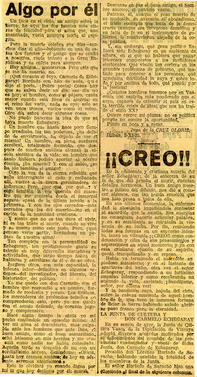 - Necrológica. También, suelto titulado ¡Creo!. Acuerdo de la Junta de Cultura en homenaje.