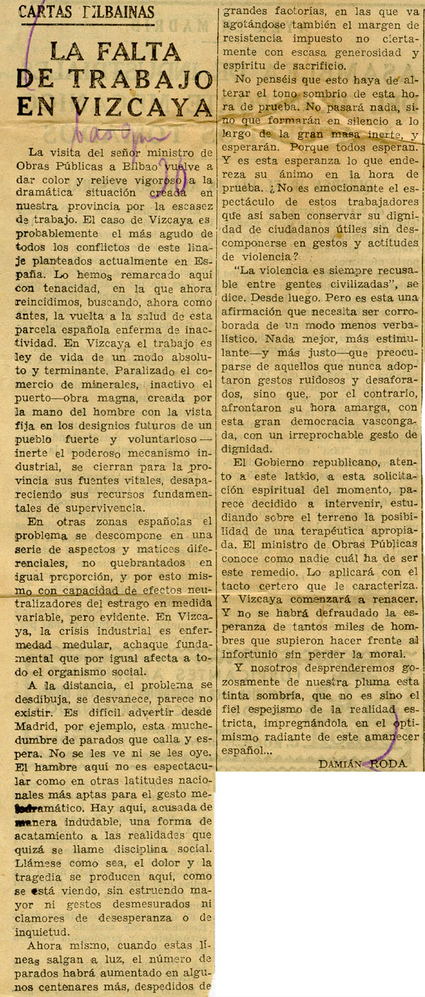 - Cartas bilbainas. La falta de trabajo en Vizcaya.