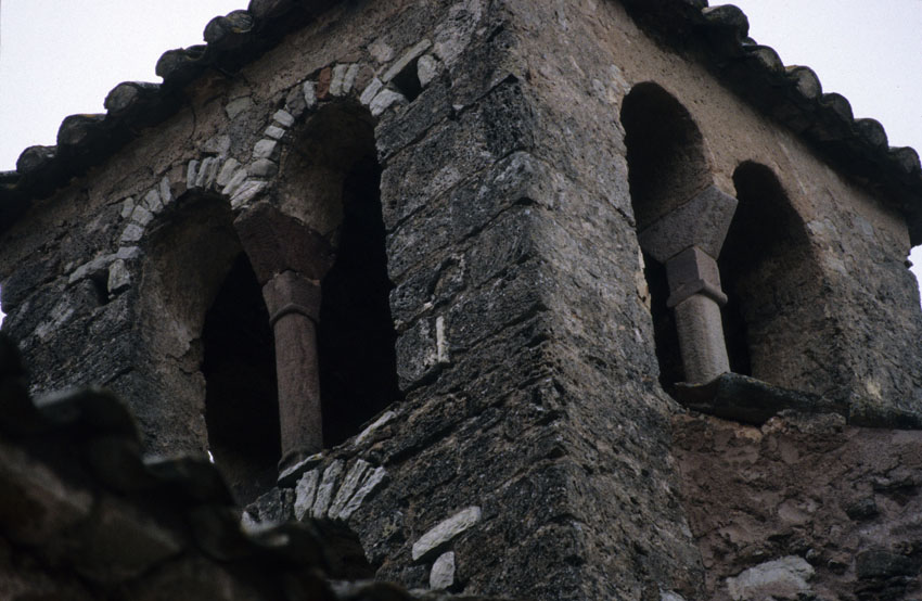 Detalle del campanario de la Iglesia de Sant Sebastià de Montmajor (Barcelona)