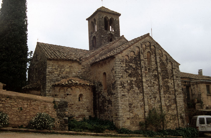 Detalle de un ábside y una fachada de la Iglesia de Sant Sebastià de Montmajor (Barcelona)