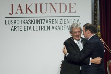 Agradezco al Lehendakari, al Diputado General de Gipuzkoa, al Consejero de cultura del Gobierno de mi tierra natal Navarra su presencia aquí como representantes de la sociedad. Una sociedad que se preocupa de lo que ocurre en las fronteras del conocimiento, que respeta y valora las diversas formas del humanismo, las letras y las ciencias, crea por el mero hecho de hacerlo un clima de calidad, de exigencia, en el enfoque de los problemas que se transmite como por osmosis al resto de sus actividades.