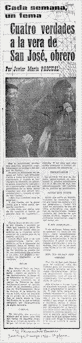 Recorte de prensa de "El Pensamiento Navarro", firmado por Javier Mª Pascual, titulado: "Cuatro verdades a la vera de San José Obrero", en torno a la festividad del Primero de mayo.