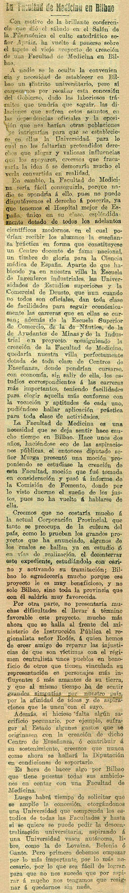- Artículo abogando por la creación de una facultad de Medicina que completaría la oferta de Deusto y de las proyectadas escuelas de Naútica, Minas e Industriales.