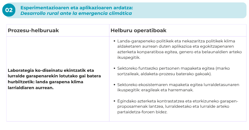 2025eko ekitaldirako proposatutako estrategia, helburu eta ekintzen diseinu metodologikoa, Solas-Ola Lurralde Laborategiaren egonkortasuna bermatzeko beharrezko baldintzak sortzeko mekanismo gisa planteatzen dira. Gainera, esperimentatzeko, aplikatzeko eta kontrastatzeko espazioa eskaintzen da, gai jakin bati buruz jardunez: Landa garapena klima larrialdiaren aurrean.