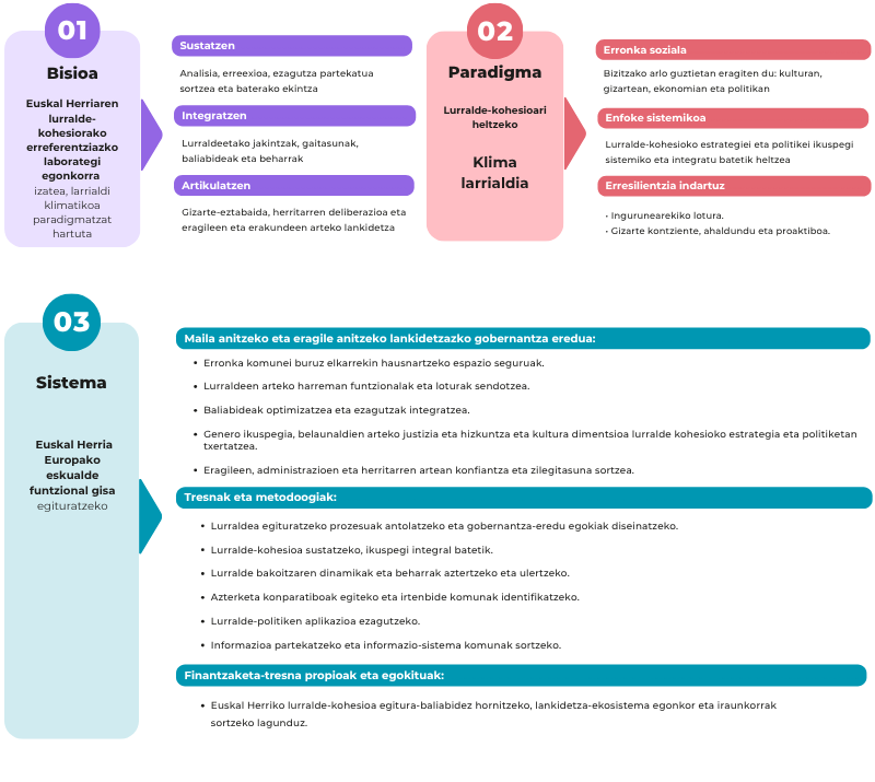 Euskal Herriaren etorkizuneko lurralde kohesioak eta eskualde funtzional gisa egituratzeak duen garrantzia azpimarratzen da txosten horretan, bereziki klima larrialdiaren testuinguruan. Lurralde laborategiak esperimentazio eta berrikuntza gune gisa proposatzen dira, kohesioa, gobernantza parte-hartzailea eta trantsizio jasangarria sustatzeko.
