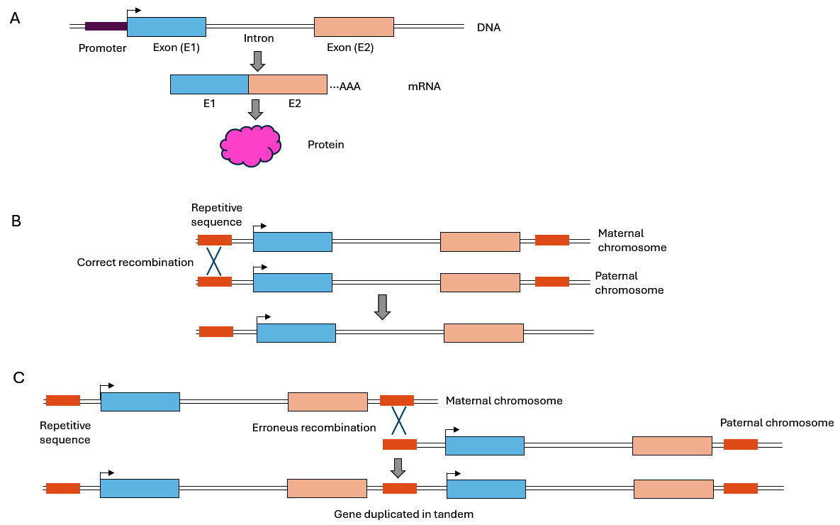 C) Schematic mechanism of an erroneous recombination event (unequal meiotic crossover), caused by misalignment of repetitive DNA sequences (represented as dark orange boxes), that results in the emergence of a tandem duplication.