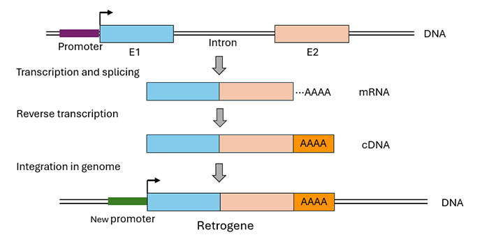 In this mechanism, a messenger RNA (mRNA) that is transcribed from a given gene undergoes intron removal during maturation and is then reverse transcribed into a complementary DNA (cDNA) copy, which is inserted into the genome (Figure 3). This process requires an active reverse transcriptase activity in the cell, which, in mammals, is provided by LINE-1 (L1) retrotransposons present in high numbers in the genome (Feng et al., 1996. Esnault et al., 2000). The resulting retrocopied genes (retrogenes) only contain exon information, and lack parental introns.