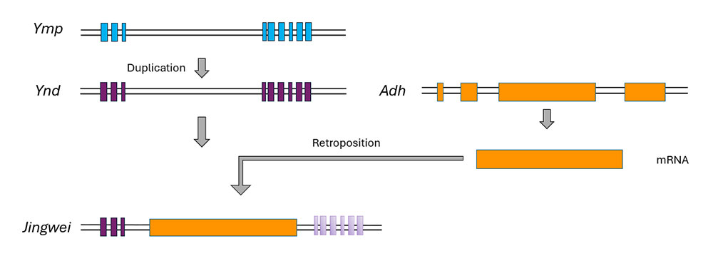 DNA-based duplication of ymp gave origin to ynd. Subsequent RNA-based retroposition of an Adh copy into ynd led to the origin of the jgw gene around 2 million years ago.