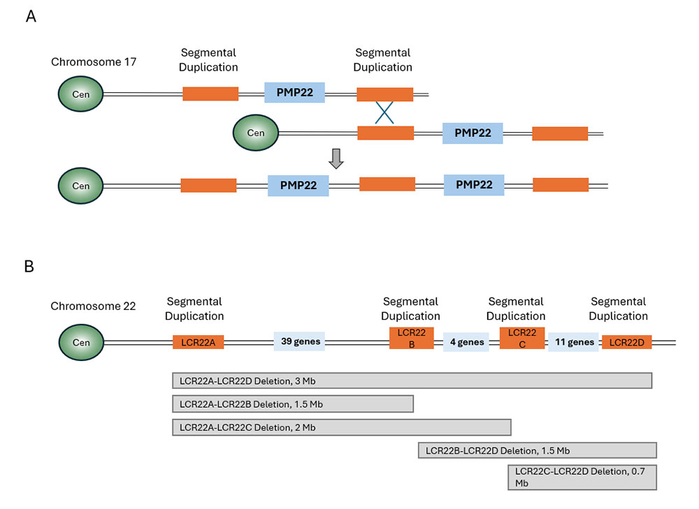 For example, SDs mediate a recurrent genomic rearrangement on the short arm of chromosome 17 leading to the duplication of the single gene, PMP22 (Figure 11A). Duplication of this gene is the most common cause of the Charcot-Marie-Tooth type IA (CMT1A, OMIM #118220) syndrome (Lupsky, et al., 1992), where the production of too much PMP22 protein causes breakdown of the protective myelin sheath around the nerves, resulting in peripheral nerve damage and muscle weakness in affected individuals.